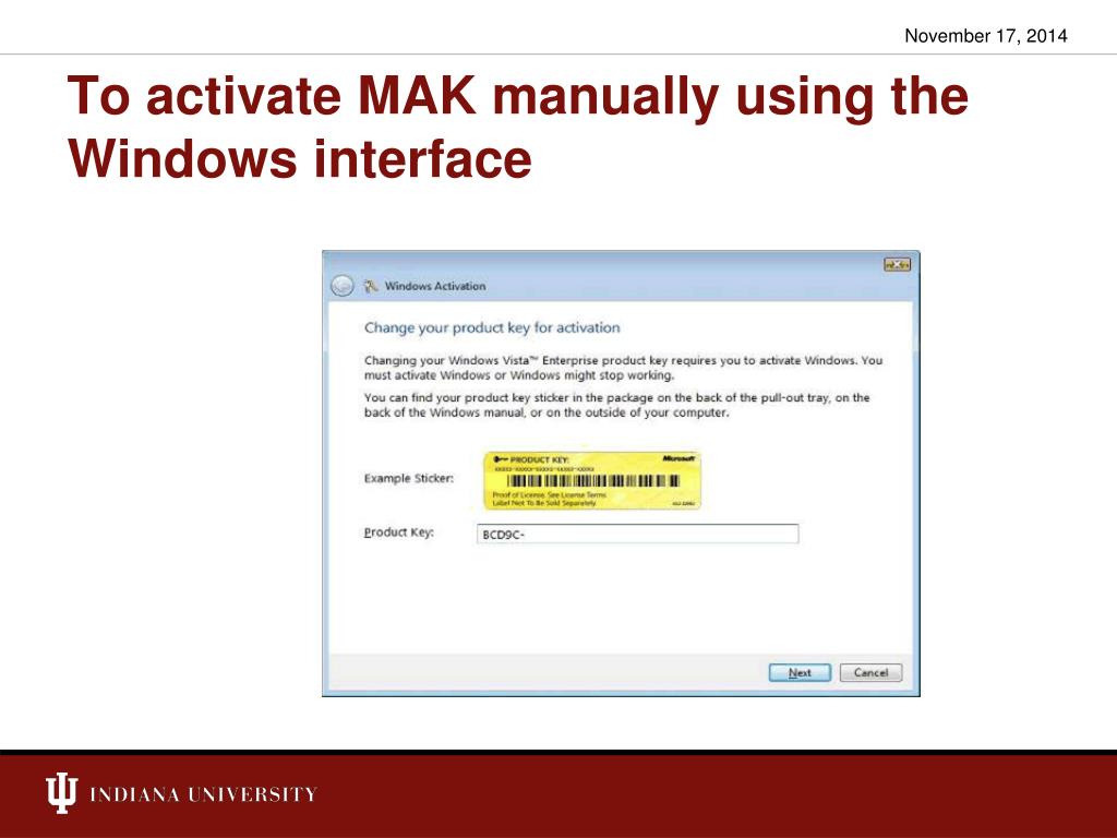 Choosing between MAK and KMS MAK KMS CONs 180 Day Lease Requires connecting to KMS server Restricted to the IU network PROs Put the machine in ADS and you don’t have to do anything else as long as the machine is on the IU network Unlimited number of Activations! • PROs • One time activation • Doesn’t need KMS • Familiar • CONs • You have do an activation • Reactivate with major upgrades • Possible Black Listing/ Key Exhaustion