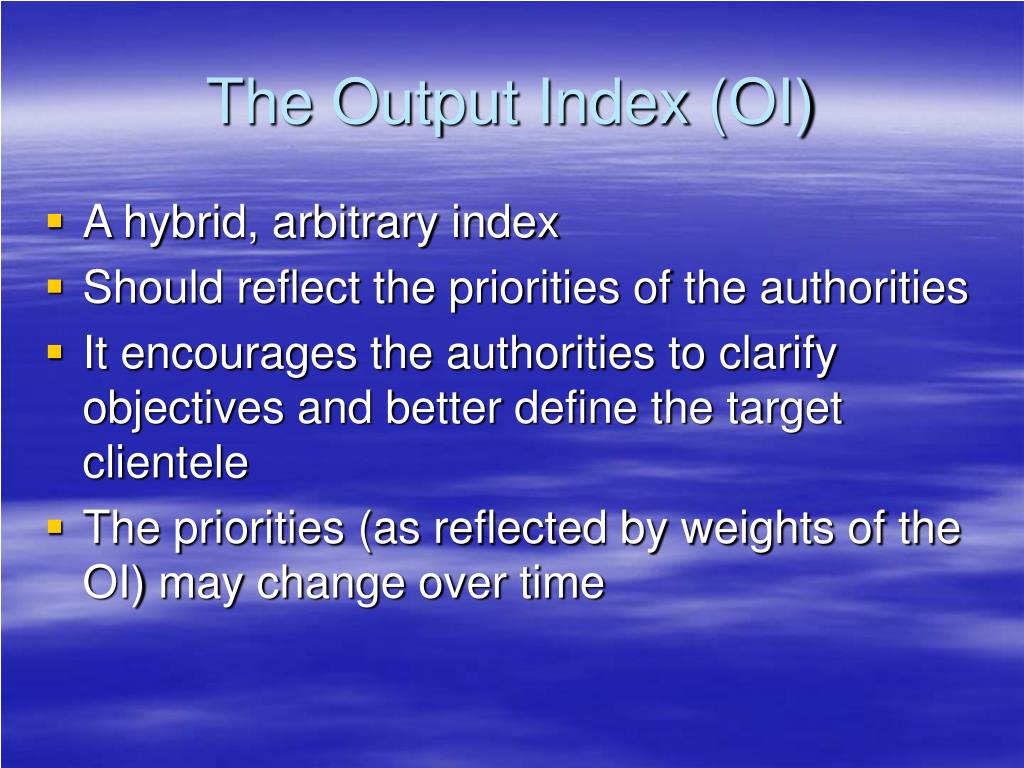 The Output Index (OI) • A hybrid, arbitrary index • Should reflect the priorities of the authorities • It encourages the authorities to clarify objectives and better define the target clientele • The priorities (as reflected by weights of the OI) may change over time