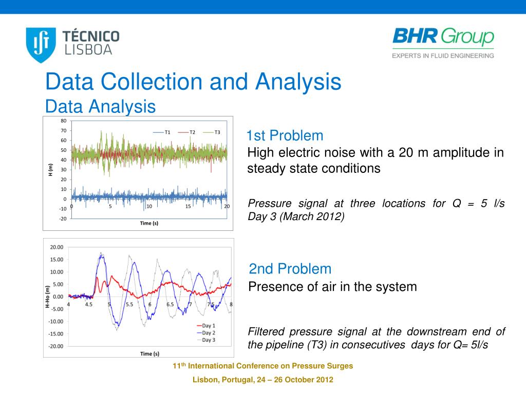 Data Collection and AnalysisData Analysis 1stProblem Highelectric noise with a 20 m amplitude in steadystateconditions Pressuresignalatthreelocations for Q = 5 l/sDay 3 (March 2012) 2ndProblem Presenceofair in thesystem Filteredpressuresignalatthedownstreamendofthe pipeline (T3) in consecutivesdays for Q= 5l/s