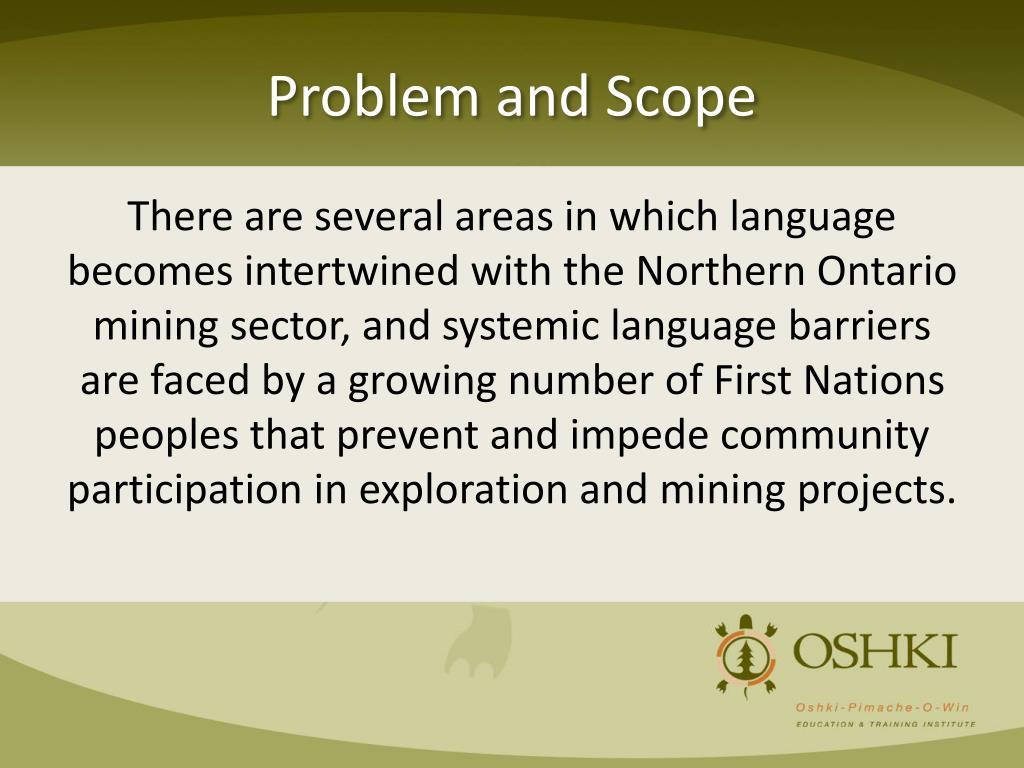 Problem and Scope There are several areas in which language becomes intertwined with the Northern Ontario mining sector, and systemic language barriers are faced by a growing number of First Nations peoples that prevent and impede community participation in exploration and mining projects.