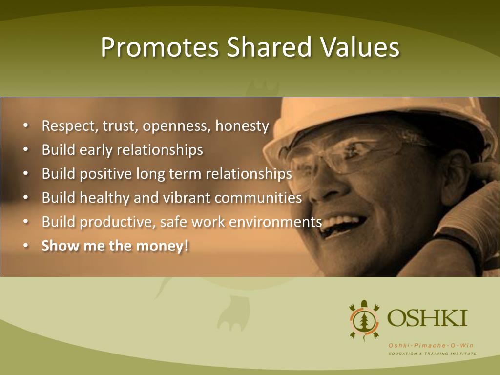 Promotes Shared Values • Respect, trust, openness, honesty • Build early relationships • Build positive long term relationships • Build healthy and vibrant communities • Build productive, safe work environments • Show me the money!