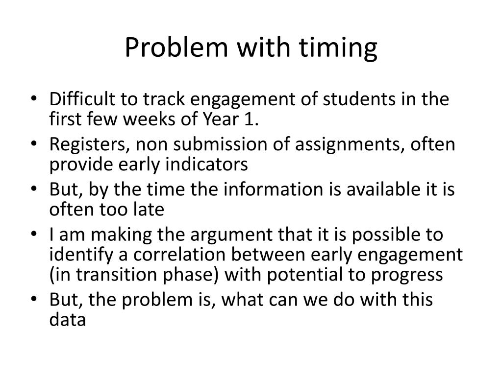 Problem with timing • Difficult to track engagement of students in the first few weeks of Year 1. • Registers, non submission of assignments, often provide early indicators • But, by the time the information is available it is often too late • I am making the argument that it is possible to identify a correlation between early engagement (in transition phase) with potential to progress • But, the problem is, what can we do with this data