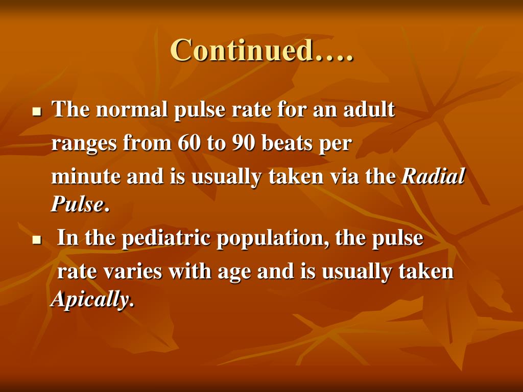Continued…. • The normal pulse rate for an adult ranges from 60 to 90 beats per minute and is usually taken via the Radial Pulse. • In the pediatric population, the pulse rate varies with age and is usually taken Apically.