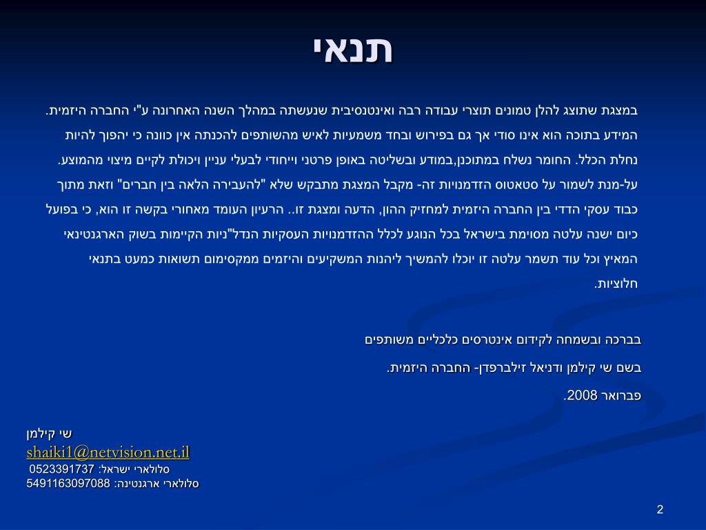 תנאי במצגת שתוצג להלן טמונים תוצרי עבודה רבה ואינטנסיבית שנעשתה במהלך השנה האחרונה ע"י החברה היזמית. המידע בתוכה הוא אינו סודי אך גם בפירוש ובחד משמעיות לאיש מהשותפים להכנתה אין כוונה כי יהפוך להיות נחלת הכלל. החומר נשלח במתוכנן,במודע ובשליטה באופן פרטני וייחודי לבעלי עניין ויכולת לקיים מיצוי מהמוצע. על-מנת לשמור על סטאטוס הזדמנויות זה- מקבל המצגת מתבקש שלא "להעבירה הלאה בין חברים" וזאת מתוך כבוד עסקיהדדי בין החברה היזמית למחזיק ההון, הדעה ומצגת זו.. הרעיון העומד מאחורי בקשה זו הוא, כי בפועל כיום ישנה עלטה מסוימת בישראל בכל הנוגע לכלל ההזדמנויות העסקיות הנדל"ניות הקיימות בשוק הארגנטינאי המאיץ וכל עוד תשמר עלטה זו יוכלו להמשיך ליהנות המשקיעים והיזמים ממקסימום תשואות כמעט בתנאי חלוציות. בברכה ובשמחה לקידום אינטרסים כלכליים משותפים בשם שי קילמן ודניאל זילברפדן- החברה היזמית. פברואר 2008. שי קילמן shaiki1@netvision.net.il סלולארי ישראל: 0523391737 סלולארי ארגנטינה: 5491163097088