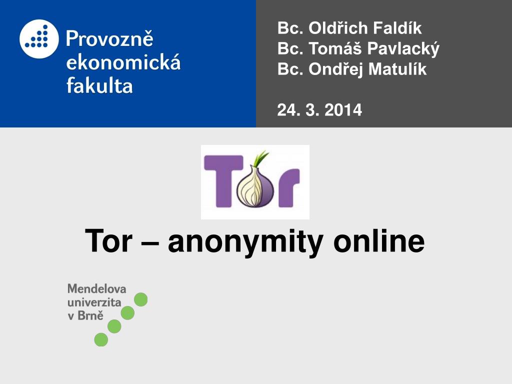 Bc. Oldřich Faldík Bc. Tomáš Pavlacký Bc. Ondřej Matulík 24. 3 . 2014. Tor – anonymity online . Tor. O pen source proje ct Tails Orbot Tor Browser Provides anonymity Used by dissidents in non-democratic countries, military agents, activists, whistleblowers. The Tor network .