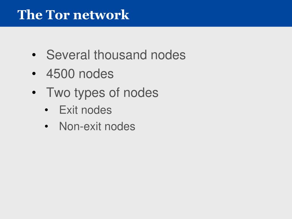 The Tor network • Several thousand nodes • 4500 nodes • Two types of nodes • Exit nodes • Non-exit nodes