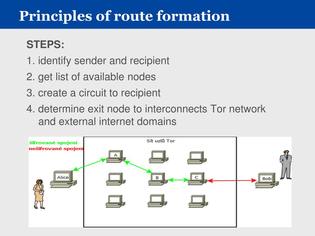 Principles of route formation • STEPS: • 1. identifysender and recipient • 2. get list ofavailablenodes • 3. create a circuit to recipient • 4. determine exit node to interconnects Tor network and external internet domains