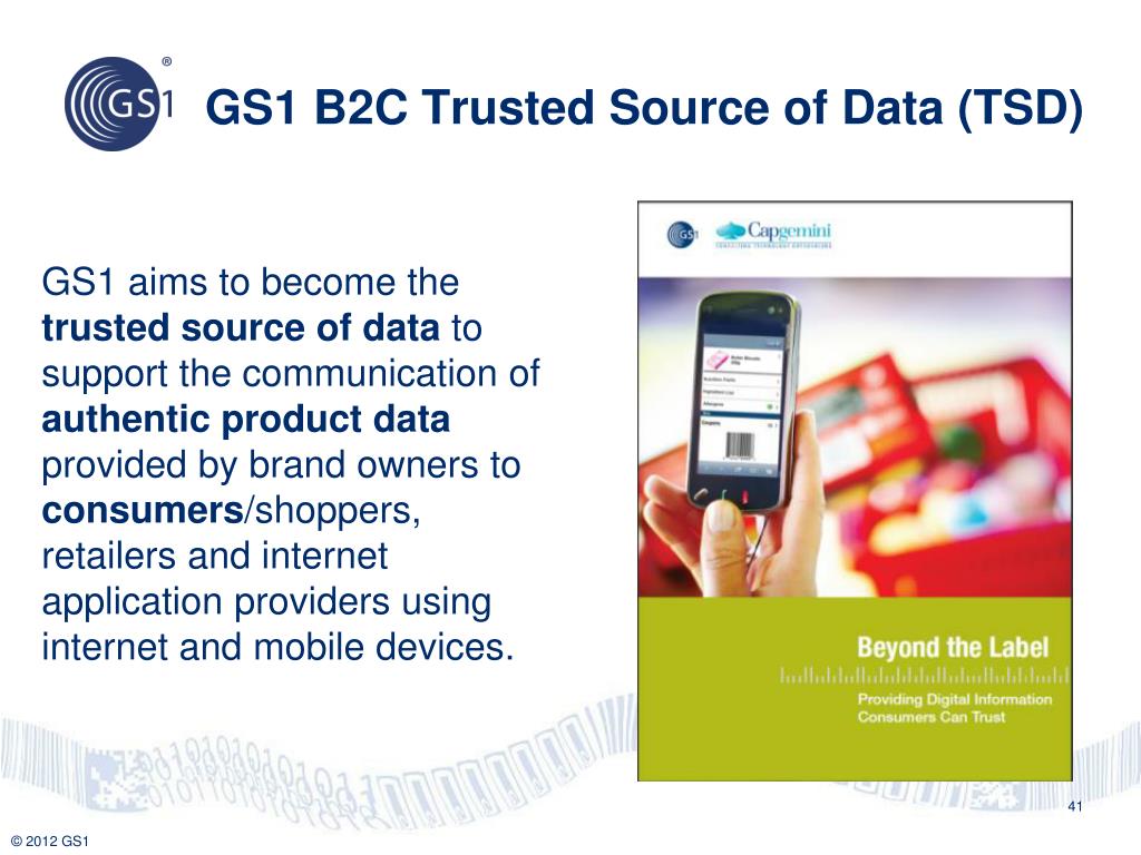 GS1 B2C Trusted Source of Data (TSD) GS1 aims to become the trusted source of data to support the communication of authentic product data provided by brand owners to consumers/shoppers,retailers and internet application providers using internet and mobile devices. 41