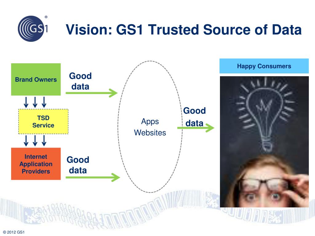 Vision: GS1 Trusted Source of Data Happy Consumers Apps Websites Brand Owners Gooddata Good data TSDService Internet Application Providers Gooddata