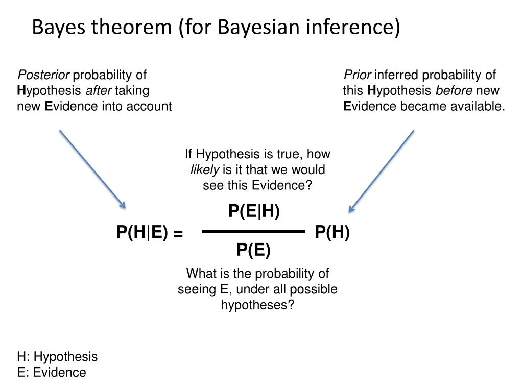 Bayes theorem (for Bayesian inference) Posterior probability of Hypothesis after taking new Evidence into account Prior inferred probability of this Hypothesis before new Evidence became available. P(E|H) If Hypothesis is true, how likely is it that we would see this Evidence? P(H|E) = P(H) P(E) What is the probability of seeing E, under all possible hypotheses? H: Hypothesis E: Evidence