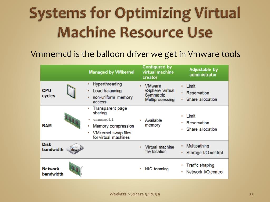 Systems for Optimizing Virtual Machine Resource Use Vmmemctl is the balloon driver we get in Vmware tools Week#12 vSphere 5.1 & 5.5