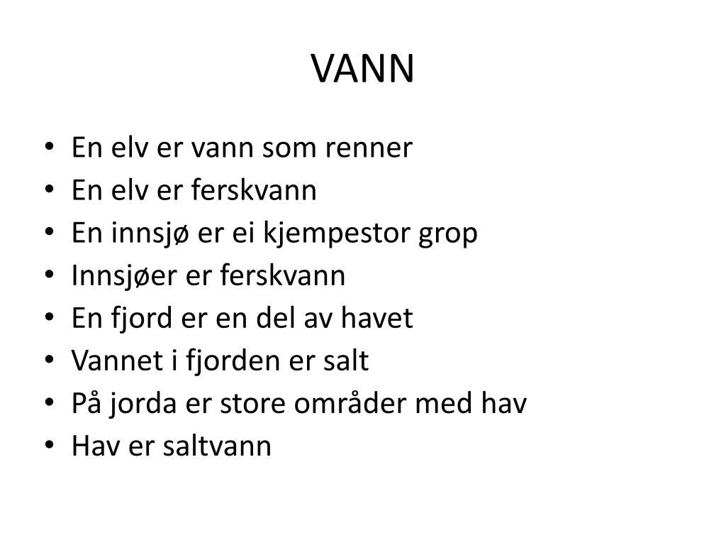 VANN • En elv er vann som renner • En elv er ferskvann • En innsjø er ei kjempestor grop • Innsjøer er ferskvann • En fjord er en del av havet • Vannet i fjorden er salt • På jorda er store områder med hav • Hav er saltvann