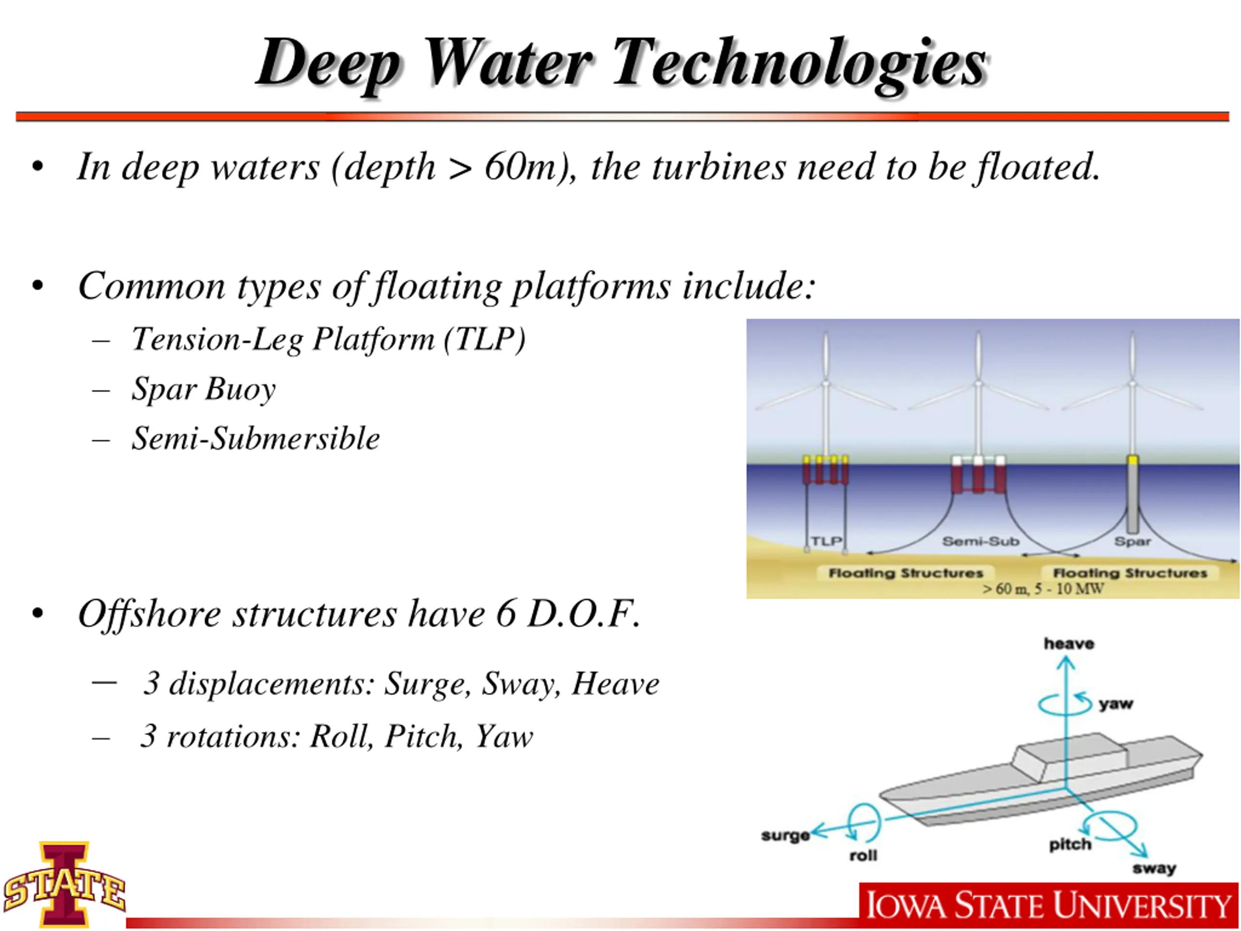 Deep Water Technologies • In deep waters (depth > 60m), the turbines need to be floated. • Common types of floating platforms include: – Tension-Leg Platform (TLP) – Spar Buoy – Semi-Submersible • Offshore structures have 6 D.O.F. – 3 displacements: Surge, Sway, Heave – 3 rotations: Roll, Pitch, Yaw