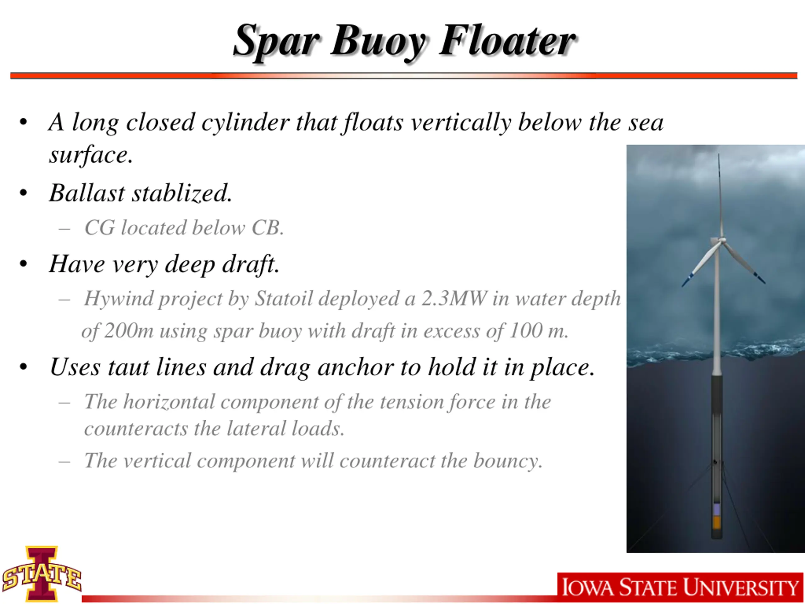 Spar Buoy Floater • A long closed cylinder that floats vertically below the sea surface. • Ballast stablized. – CG located below CB. • Have very deep draft. – Hywind project by Statoil deployed a 2.3MW in water depth of 200m using spar buoy with draft in excess of 100 m. • Uses taut lines and drag anchor to hold it in place. – The horizontal component of the tension force in the counteracts the lateral loads. – The vertical component will counteract the bouncy. lines