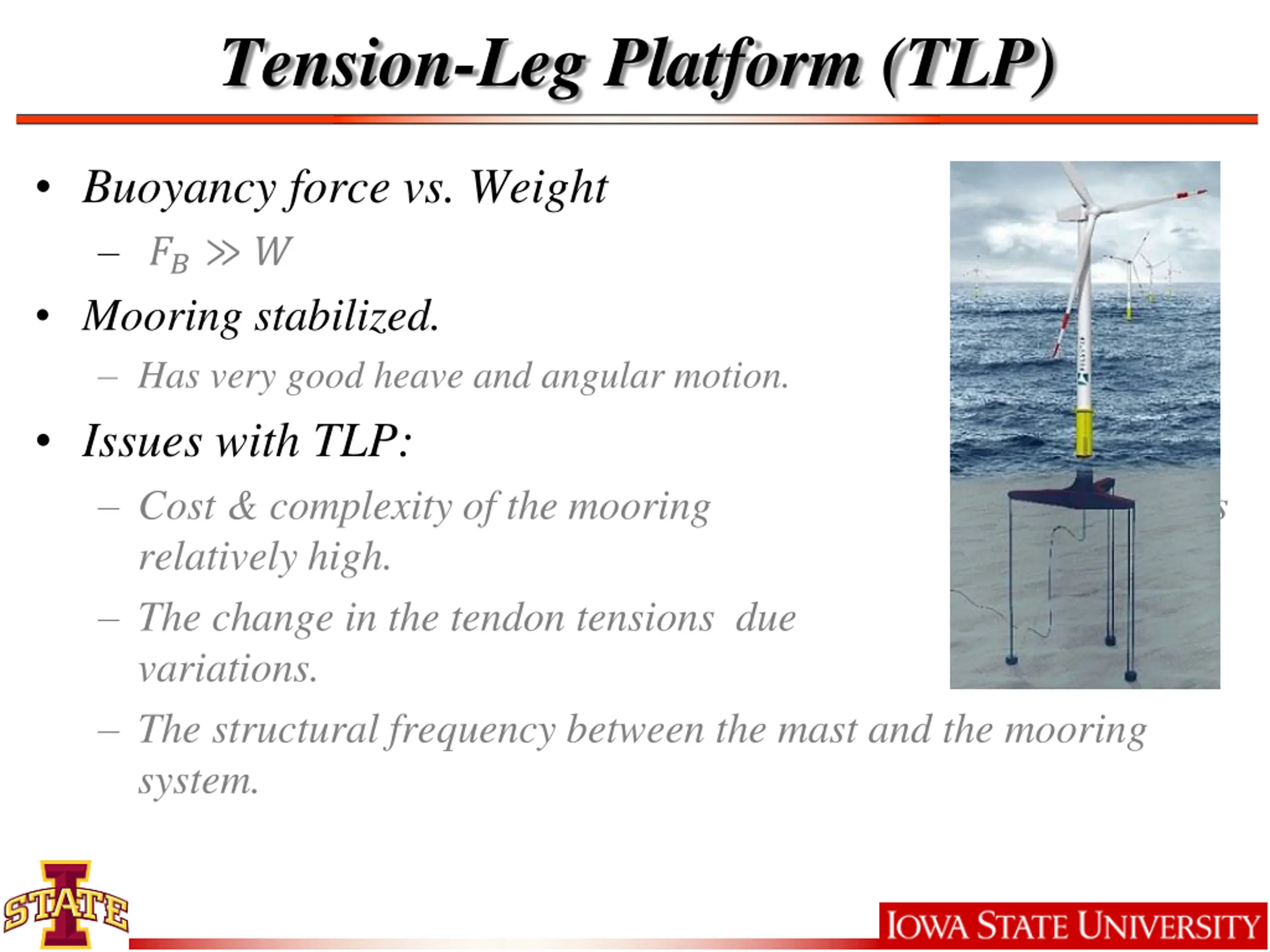 Tension-Leg Platform (TLP) • Buoyancy force vs. Weight – ??≫ ? • Mooring stabilized. – Has very good heave and angular motion. • Issues with TLP: – Cost & complexity of the mooring relatively high. – The change in the tendon tensions due variations. – The structural frequency between the mast and the mooring system. installation is to tidal