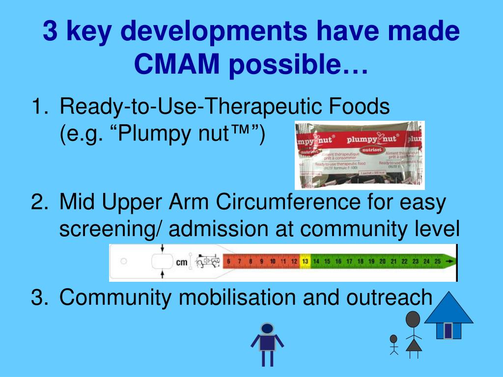 3 key developments have made CMAM possible… • Ready-to-Use-Therapeutic Foods (e.g. “Plumpy nut™”) • Mid Upper Arm Circumference for easy screening/ admission at community level • Community mobilisation and outreach