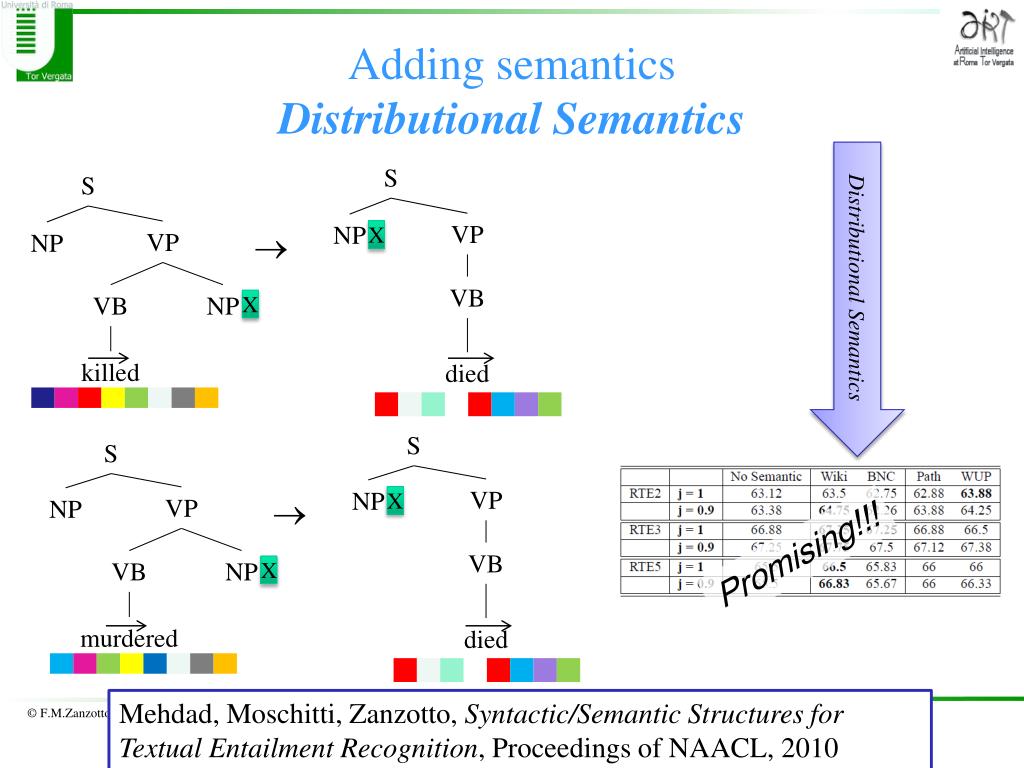 AddingsemanticsDistributional Semantics S S VP NP X VP NP Distributional Semantics VB VB NP X killed died S S VP NP X VP NP Promising!!! VB VB NP X murdered died Mehdad, Moschitti, Zanzotto, Syntactic/SemanticStructures for TextualEntailmentRecognition, Proceedings of NAACL, 2010