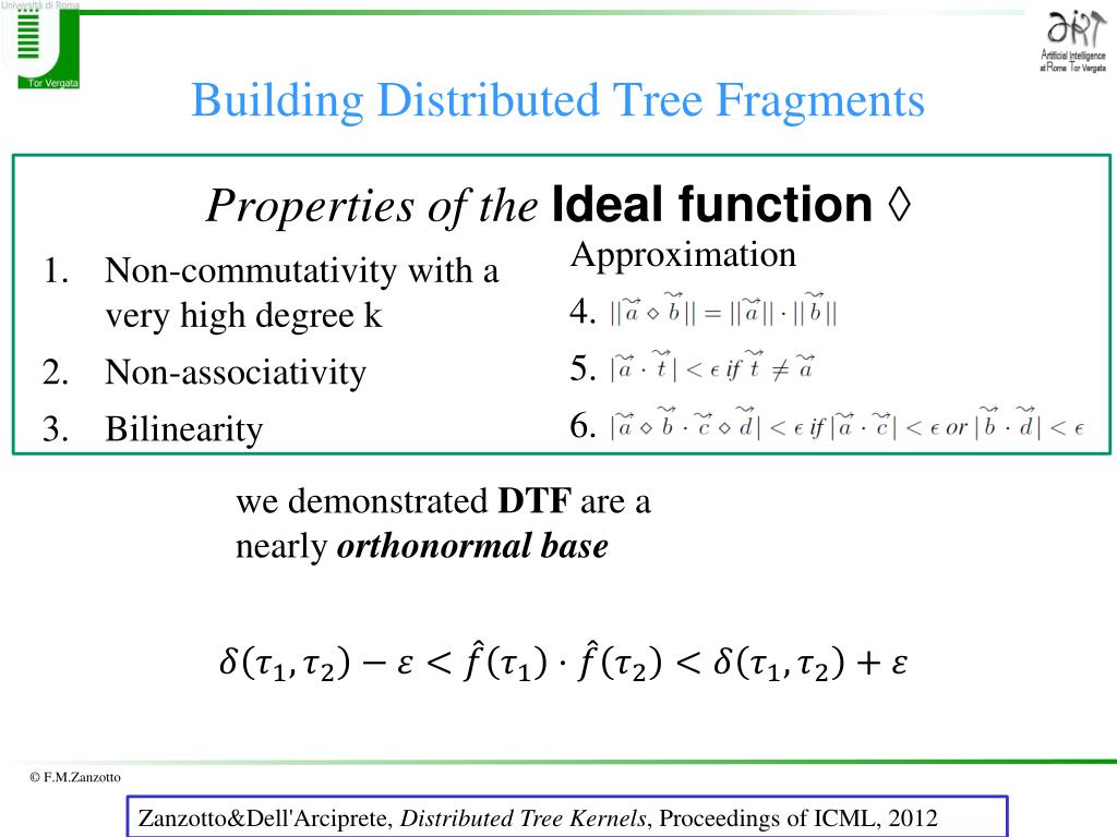 Building Distributed Tree Fragments Properties of the Ideal function Approximation Non-commutativity with a very high degree k Non-associativity Bilinearity wedemonstratedDTF are a nearlyorthonormal base Zanzotto&Dell'Arciprete, Distributed TreeKernels, Proceedings of ICML, 2012