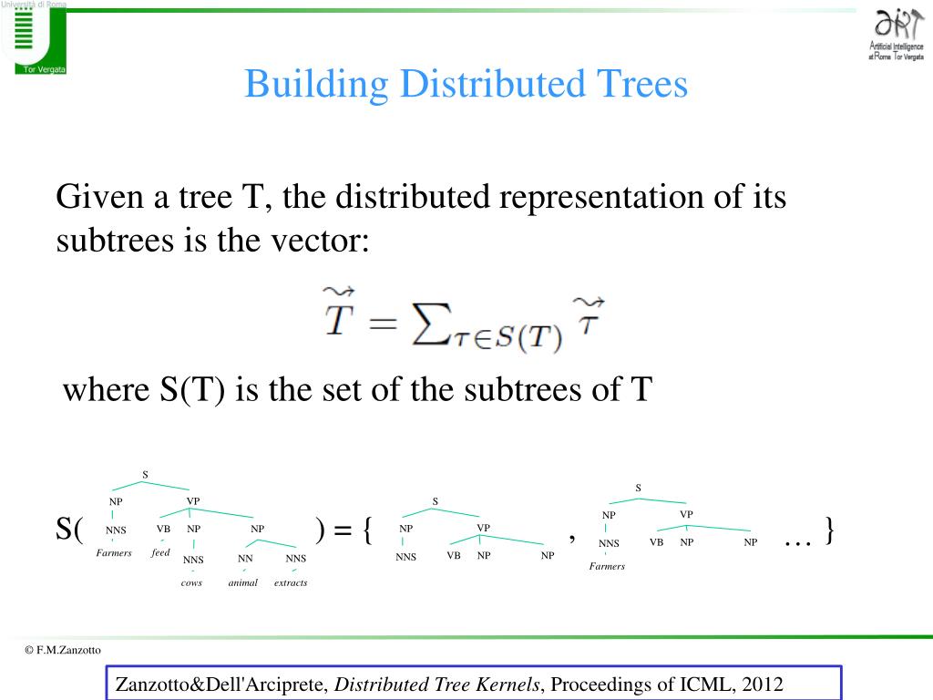 S S VP NP VB NP NP NNS VP NP S VB NP NP NNS VP NP feed Farmers VB NP NP NNS NN NNS NNS Farmers cows animal extracts Building Distributed Trees Given a tree T, the distributed representation of its subtrees is the vector: where S(T) is the set of the subtrees of T S( ) = { , } … Zanzotto&Dell'Arciprete, Distributed TreeKernels, Proceedings of ICML, 2012