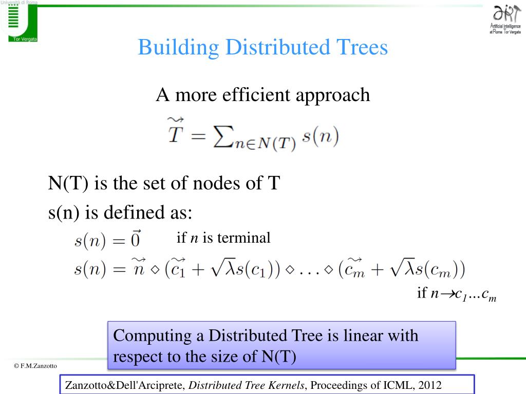 Building Distributed Trees A more efficientapproach N(T) is the set of nodes of T s(n) isdefinedas: if n is terminal if nc1…cm Computing a Distributed Treeis linear with respect to the size of N(T) Zanzotto&Dell'Arciprete, Distributed TreeKernels, Proceedings of ICML, 2012