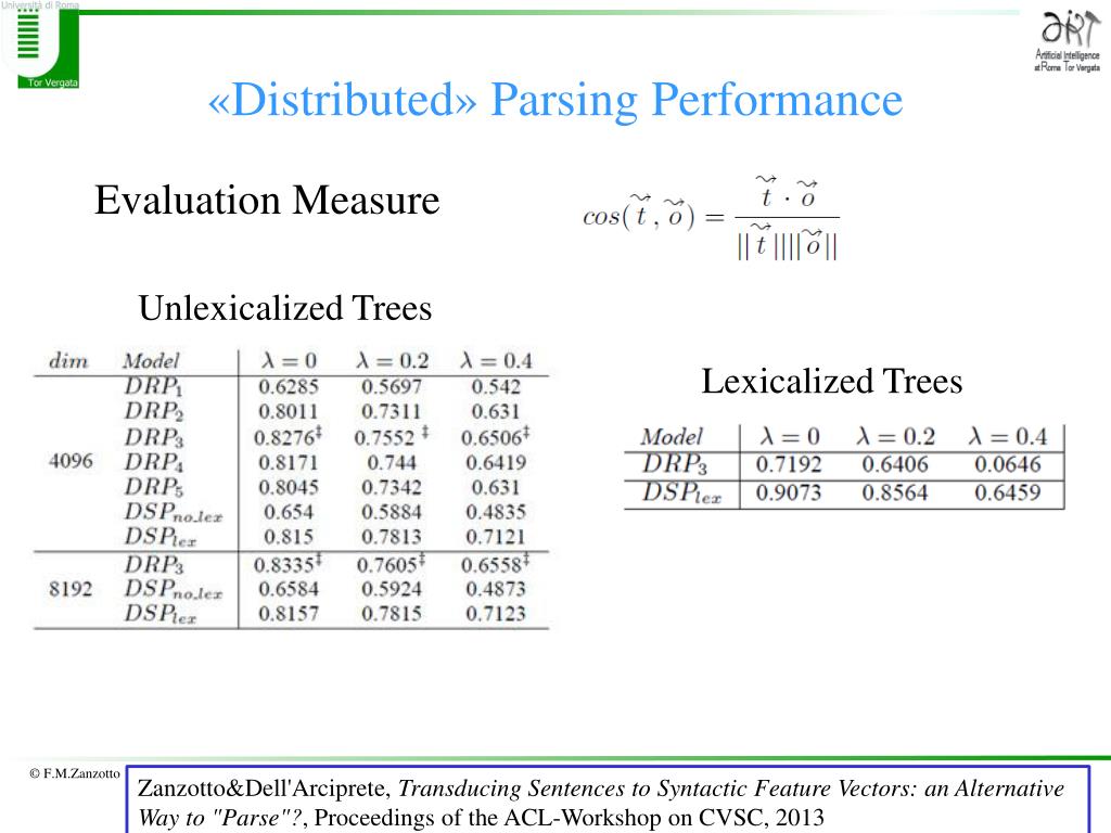 «Distributed» Parsing Performance Evaluation Measure UnlexicalizedTrees LexicalizedTrees Zanzotto&Dell'Arciprete, Transducing Sentences to Syntactic Feature Vectors: an Alternative Way to "Parse"?, Proceedings of the ACL-Workshop on CVSC, 2013