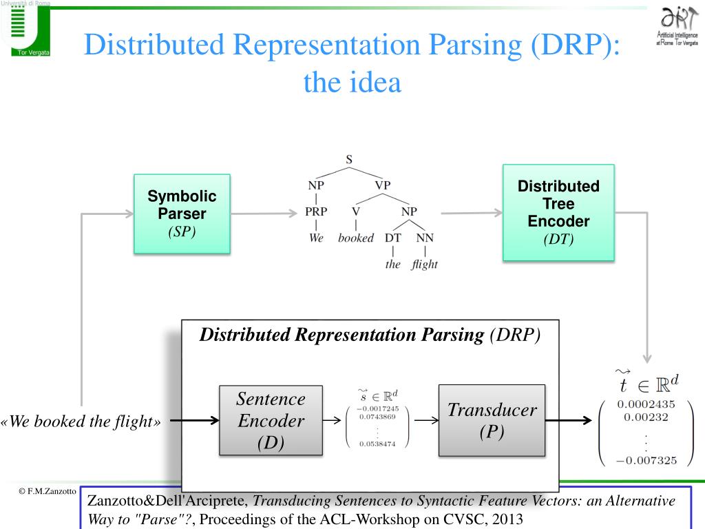 Distributed RepresentationParsing (DRP): the idea Distributed Tree Encoder (DT) SymbolicParser (SP) Distributed RepresentationParsing(DRP) Transducer (P) Sentence Encoder (D) «Webooked the flight» Zanzotto&Dell'Arciprete, Transducing Sentences to Syntactic Feature Vectors: an Alternative Way to "Parse"?, Proceedings of the ACL-Workshop on CVSC, 2013