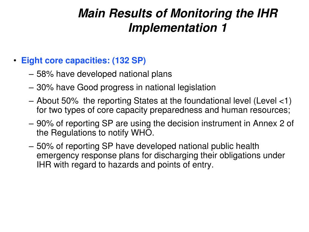 Main Results of Monitoring the IHR Implementation 1 • Eight core capacities: (132 SP) • 58% have developed national plans • 30% have Good progress in national legislation • About 50% the reporting States at the foundational level (Level <1) for two types of core capacity preparedness and human resources; • 90% of reporting SP are using the decision instrument in Annex 2 of the Regulations to notify WHO. • 50% of reporting SP have developed national public health emergency response plans for discharging their obligations under IHR with regard to hazards and points of entry.