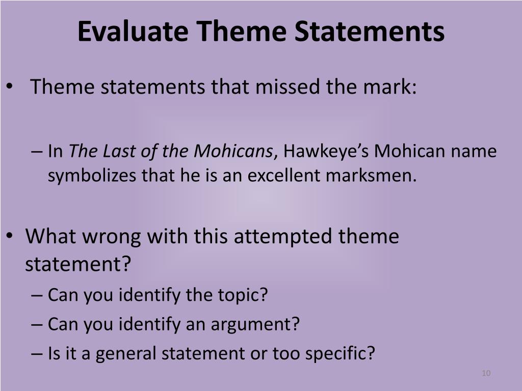 Evaluate Theme Statements • Theme statements that missed the mark: • In The Last of the Mohicans, Hawkeye’s Mohican name symbolizes that he is an excellent marksmen. • What wrong with this attempted theme statement? • Can you identify the topic? • Can you identify an argument? • Is it a general statement or too specific?