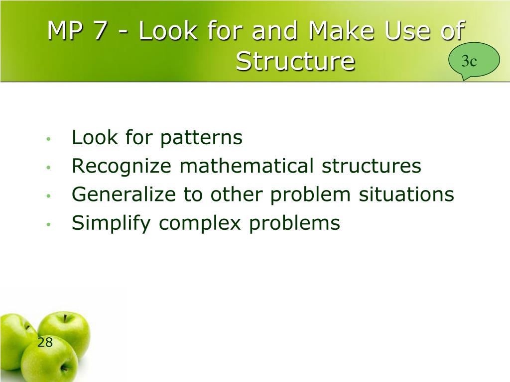 MP 7 - Look for and Make Use of Structure 3c • Look for patterns • Recognize mathematical structures • Generalize to other problem situations • Simplify complex problems