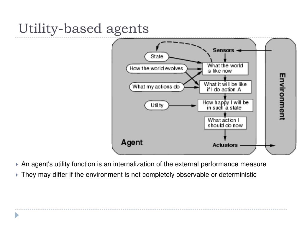 Utility-based agents • An agent's utility function is an internalization of the external performance measure • They may differ if the environment is not completely observable or deterministic