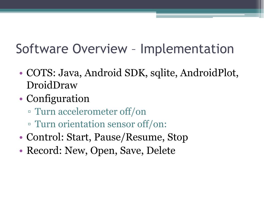 Software Overview – Implementation • COTS: Java, Android SDK, sqlite, AndroidPlot, DroidDraw • Configuration • Turn accelerometer off/on • Turn orientation sensor off/on: • Control: Start, Pause/Resume, Stop • Record: New, Open, Save, Delete