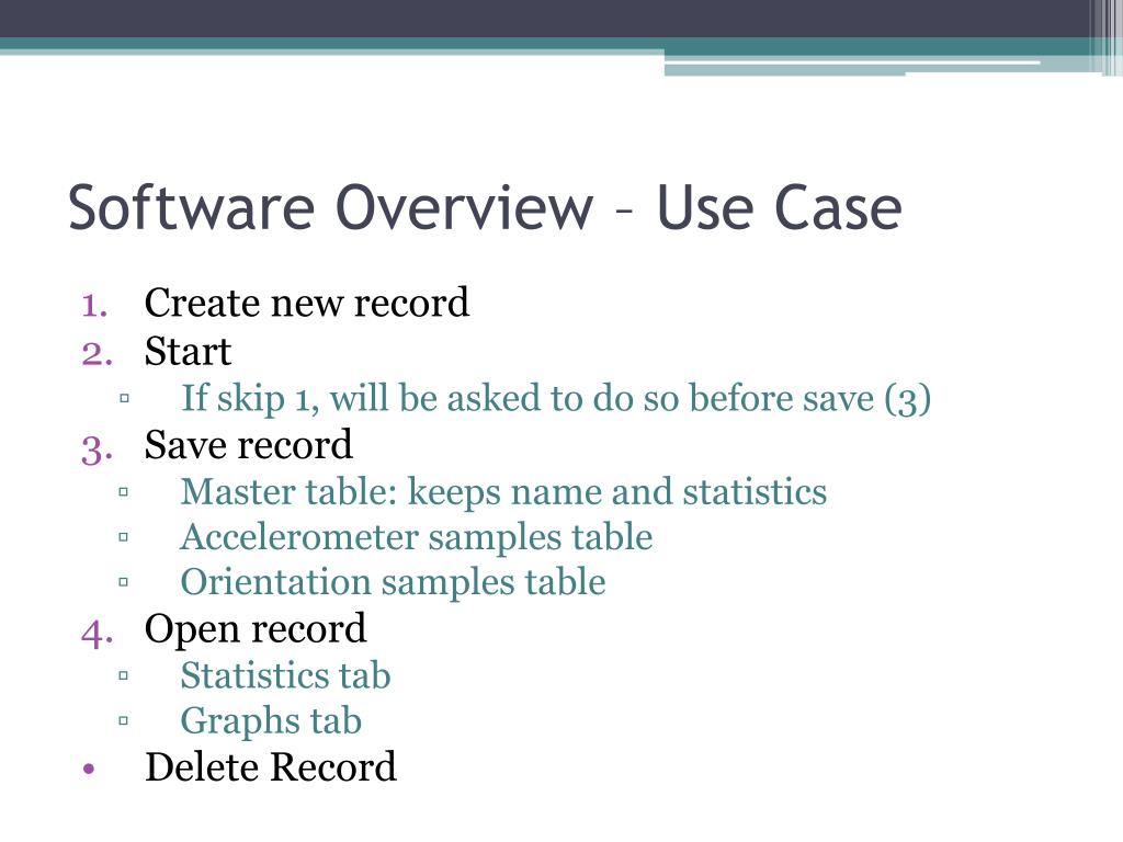 Software Overview – Use Case • Create new record • Start • If skip 1, will be asked to do so before save (3) • Save record • Master table: keeps name and statistics • Accelerometer samples table • Orientation samples table • Open record • Statistics tab • Graphs tab • Delete Record