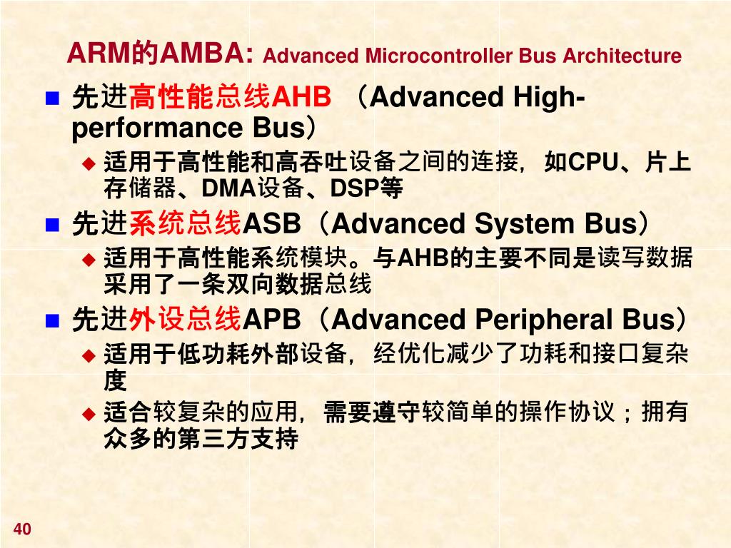 ARM的AMBA: Advanced Microcontroller Bus Architecture • 先进高性能总线AHB (Advanced High-performance Bus) • 适用于高性能和高吞吐设备之间的连接,如CPU、片上存储器、DMA设备、DSP等 • 先进系统总线ASB(Advanced System Bus) • 适用于高性能系统模块。与AHB的主要不同是读写数据采用了一条双向数据总线 • 先进外设总线APB(Advanced Peripheral Bus) • 适用于低功耗外部设备,经优化减少了功耗和接口复杂度 • 适合较复杂的应用,需要遵守较简单的操作协议;拥有众多的第三方支持