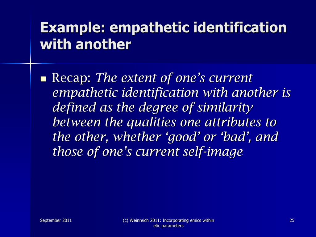 Example: empathetic identification with another • Recap: The extent of one’s current empathetic identification with another is defined as the degree of similarity between the qualities one attributes to the other, whether ‘good’ or ‘bad’, and those of one’s current self-image (c) Weinreich 2011: Incorporating emics within etic parameters