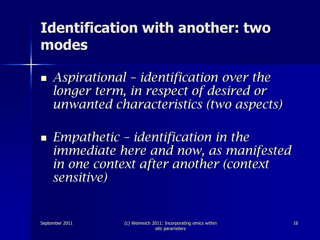 Identification with another: two modes • Aspirational – identification over the longer term, in respect of desired or unwanted characteristics (two aspects) • Empathetic – identification in the immediate here and now, as manifested in one context after another (context sensitive) (c) Weinreich 2011: Incorporating emics within etic parameters