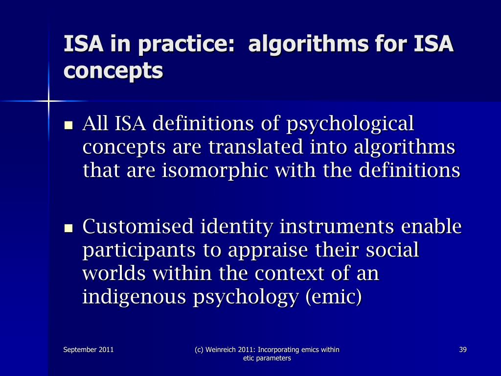 ISA in practice: algorithms for ISA concepts • All ISA definitions of psychological concepts are translated into algorithms that are isomorphic with the definitions • Customised identity instruments enable participants to appraise their social worlds within the context of an indigenous psychology (emic) (c) Weinreich 2011: Incorporating emics within etic parameters