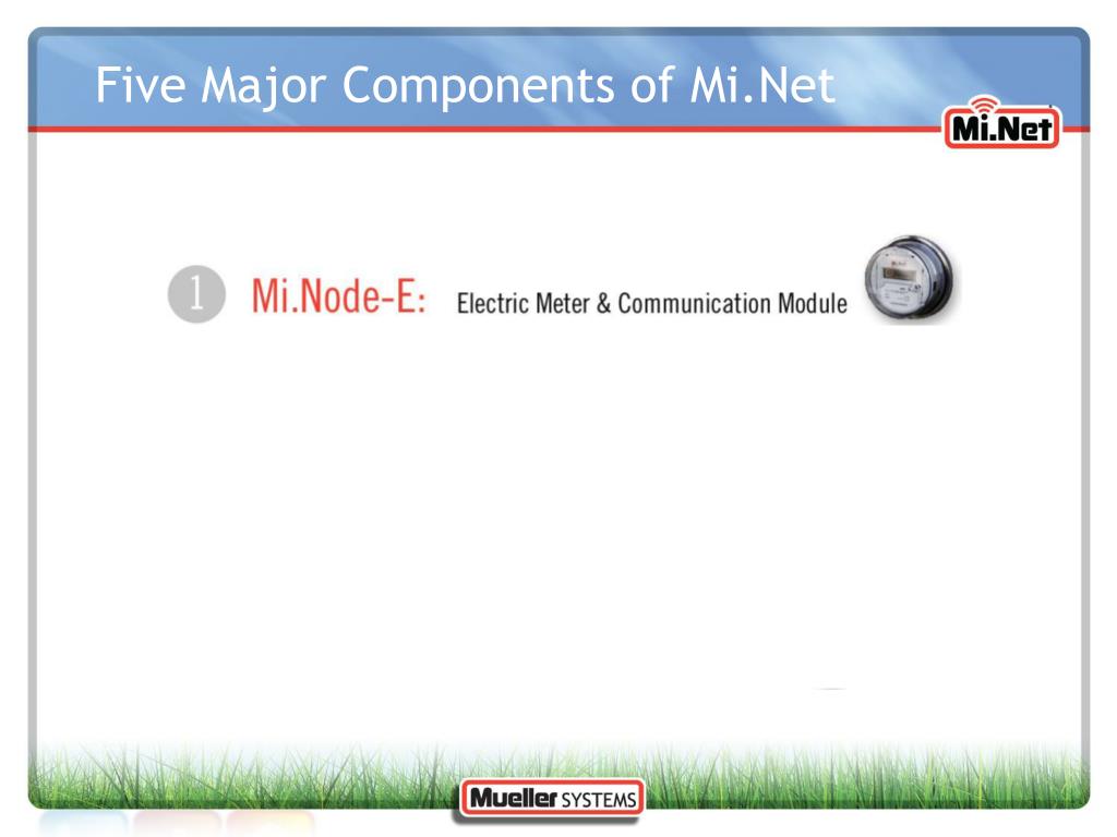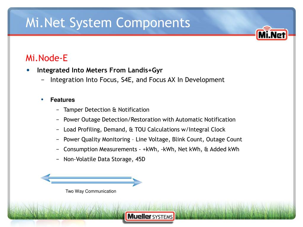 Mi.Node-E Integrated Into Meters From Landis+Gyr Integration Into Focus, S4E, and Focus AX In Development Features Tamper Detection & Notification Power Outage Detection/Restoration with Automatic Notification Load Profiling, Demand, & TOU Calculations w/Integral Clock Power Quality Monitoring – Line Voltage, Blink Count, Outage Count Consumption Measurements - +kWh, -kWh, Net kWh, & Added kWh Non-Volatile Data Storage, 45D Mi.Net System Components Two Way Communication