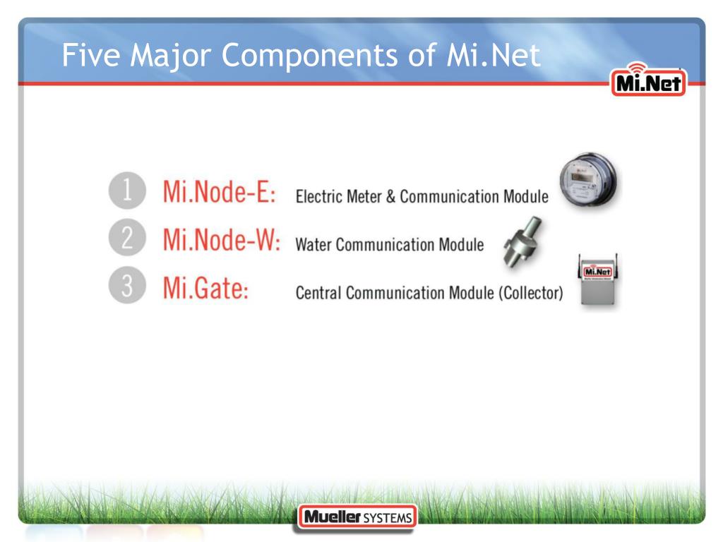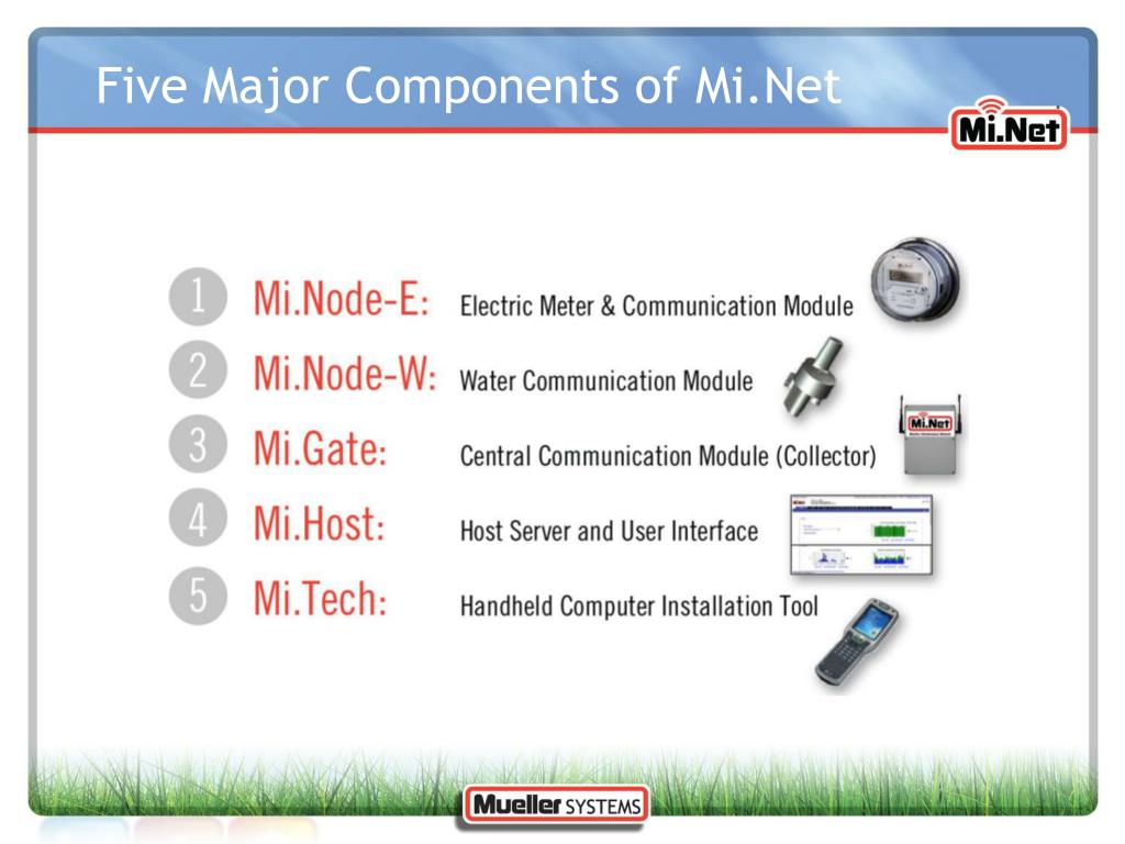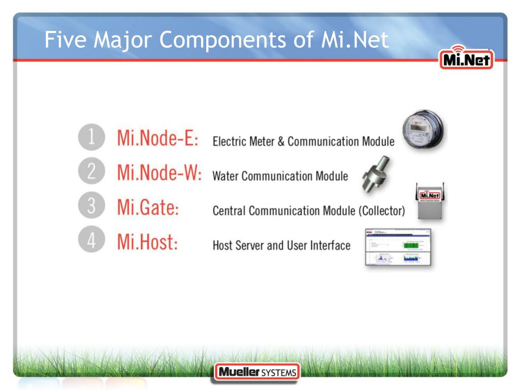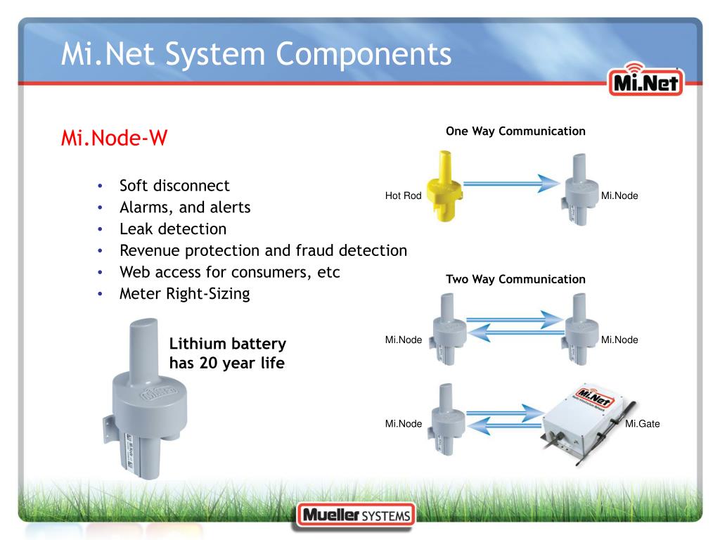 Mi.Net System Components Mi.Node-W • Soft disconnect • Alarms, and alerts • Leak detection • Revenue protection and fraud detection • Web access for consumers, etc • Meter Right-Sizing One Way Communication Hot Rod Mi.Node Two Way Communication Mi.Node Mi.Node Lithium batteryhas 20 year life Mi.Node Mi.Gate