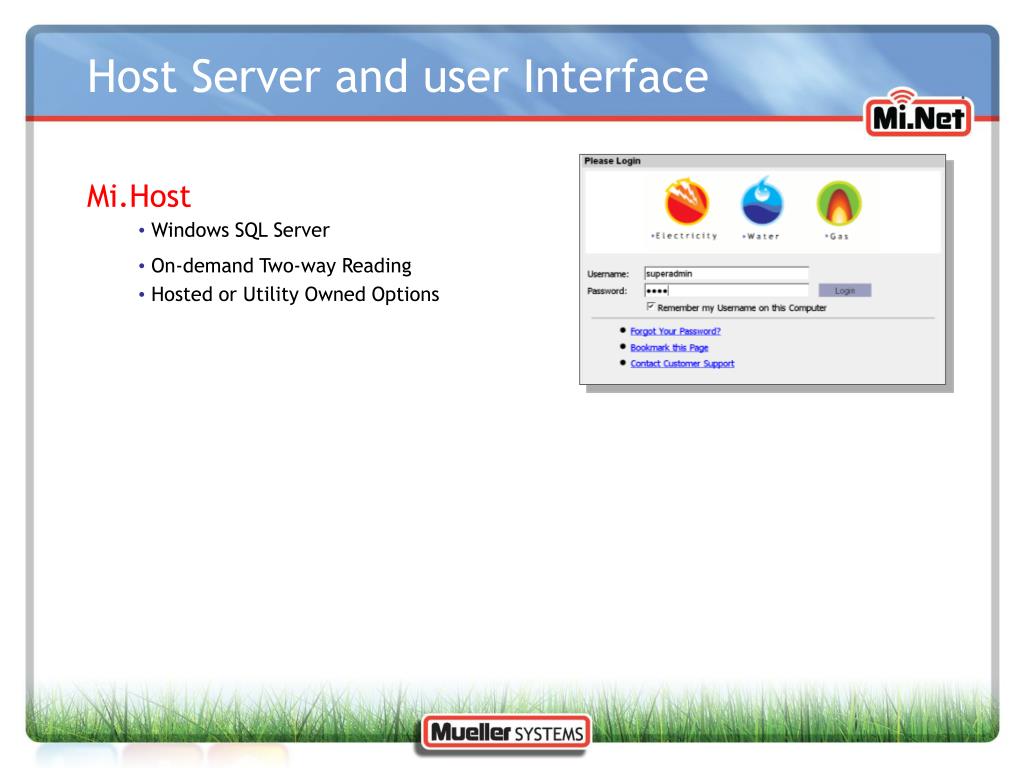 Host Server and user Interface • Mi.Host • Windows SQL Server • On-demand Two-way Reading • Hosted or Utility Owned Options