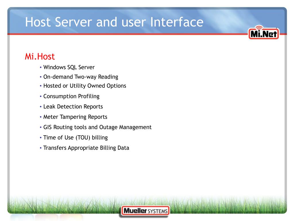 Host Server and user Interface • Mi.Host • Windows SQL Server • On-demand Two-way Reading • Hosted or Utility Owned Options • Consumption Profiling • Leak Detection Reports • Meter Tampering Reports