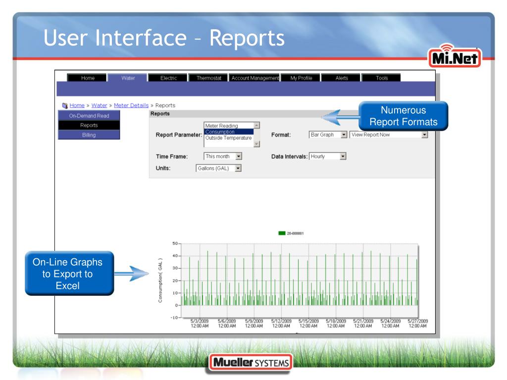 Host Server and user Interface • Mi.Host • Windows SQL Server • On-demand Two-way Reading • Hosted or Utility Owned Options • Consumption Profiling • Leak Detection Reports • Meter Tampering Reports • GIS Routing tools and Outage Management • Time of Use (TOU) billing • Transfers Appropriate Billing Data • Customer Account Access • Real-time e-mail and SMS Messages • Temperature and Precipitation Data