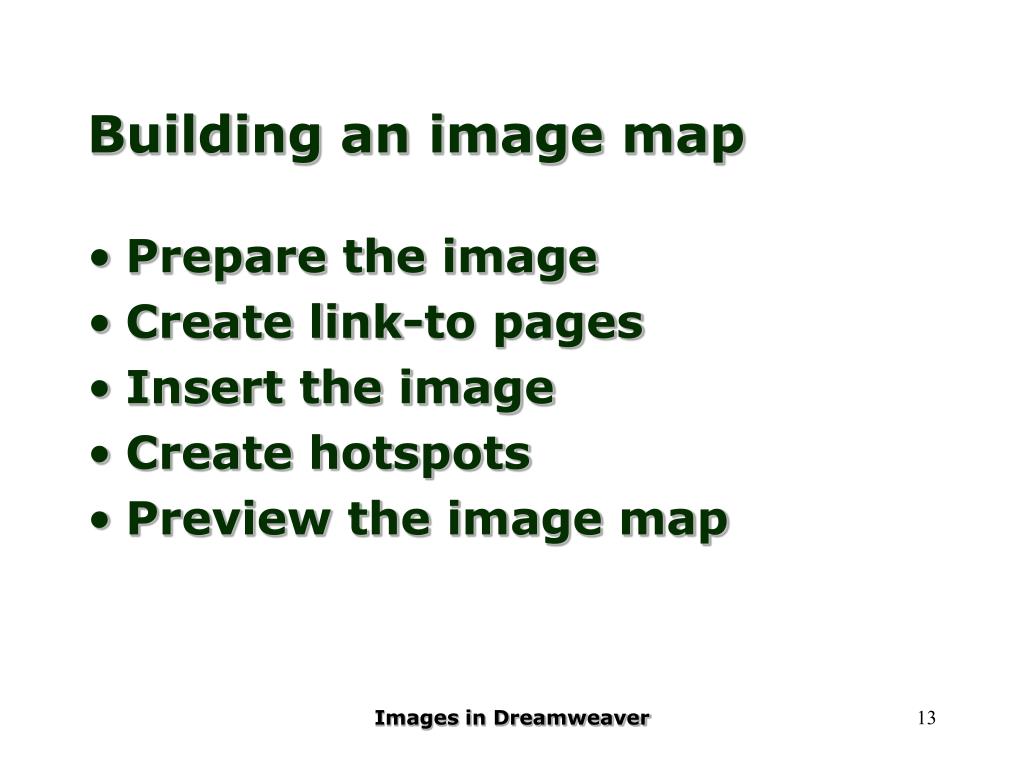 Building an image map • Prepare the image • Create link-to pages • Insert the image • Create hotspots • Preview the image map Images in Dreamweaver