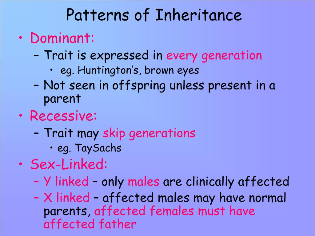 Patterns of Inheritance • Dominant: • Trait is expressed in every generation • eg. Huntington’s, brown eyes • Not seen in offspring unless present in a parent • Recessive: • Trait may skip generations • eg. TaySachs • Sex-Linked: • Y linked – only males are clinically affected • X linked – affected males may have normal parents, affected females must have affected father