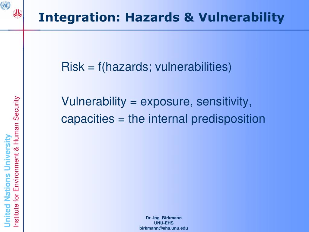 Integration: Hazards & Vulnerability Risk = f(hazards; vulnerabilities) Vulnerability = exposure, sensitivity, capacities = the internal predisposition Dr.-Ing. Birkmann UNU-EHSbirkmann@ehs.unu.edu
