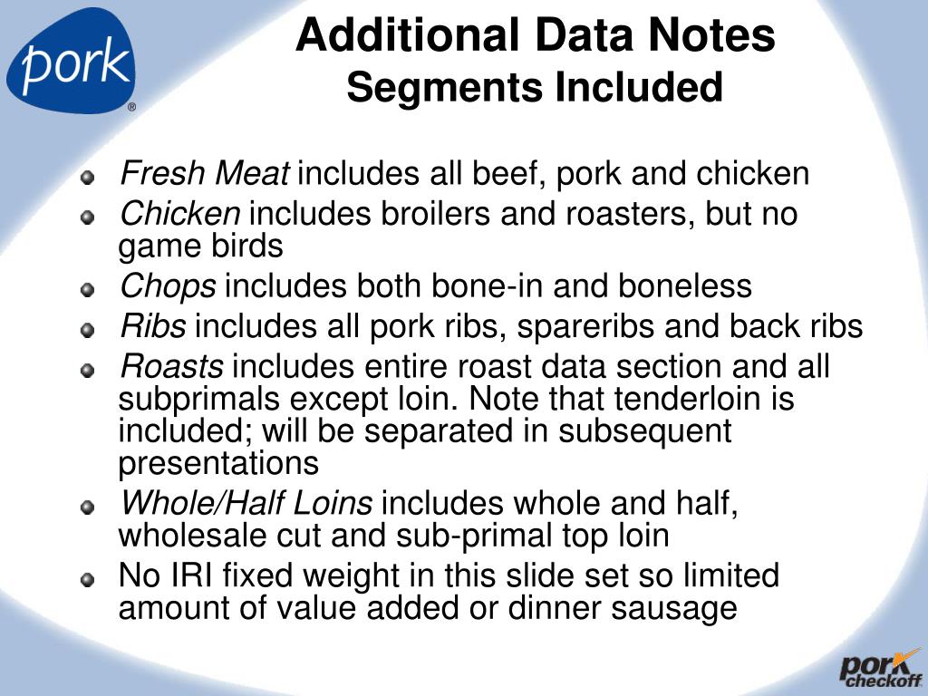 Additional Data NotesSegments Included Fresh Meat includes all beef, pork and chicken Chicken includes broilers and roasters, but no game birds Chops includes both bone-in and boneless Ribs includes all pork ribs, spareribs and back ribs Roasts includes entire roast data section and all subprimals except loin. Note that tenderloin is included; will be separated in subsequent presentations Whole/Half Loins includes whole and half, wholesale cut and sub-primal top loin No IRI fixed weight in this slide set so limited amount of value added or dinner sausage