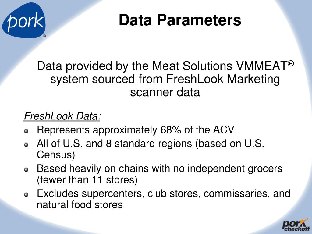 Data Parameters Data provided by the Meat Solutions VMMEAT® system sourced from FreshLook Marketing scanner data FreshLook Data: Represents approximately 68% of the ACV All of U.S. and 8 standard regions (based on U.S. Census) Based heavily on chains with no independent grocers (fewer than 11 stores) Excludes supercenters, club stores, commissaries, and natural food stores