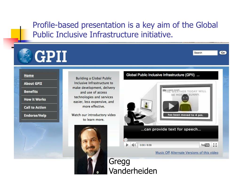 Profile-based presentation is a key aim of the Global Public Inclusive Infrastructure initiative. Gregg Vanderheiden