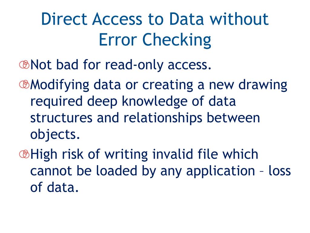 Direct Access to Data without Error Checking Not bad for read-only access. Modifying data or creating a new drawing required deep knowledge of data structures and relationships between objects. High risk of writing invalid file which cannot be loaded by any application – loss of data.