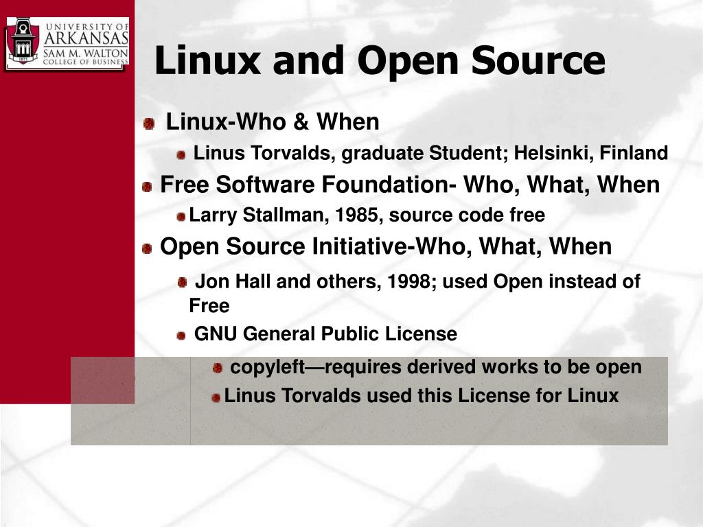 Linux and Open Source • Linux-Who & When • LinusTorvalds, graduate Student; Helsinki, Finland • Free Software Foundation- Who, What, When • Larry Stallman, 1985, source code free • Open Source Initiative-Who, What, When • Jon Hall and others, 1998; used Open instead of Free • GNU General Public License • copyleft—requires derived works to be open • LinusTorvalds used this License for Linux