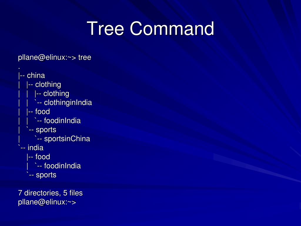 Tree Command pllane@elinux:~> tree . |-- china | |-- clothing | | |-- clothing | | `-- clothinginIndia | |-- food | | `-- foodinIndia | `-- sports | `-- sportsinChina `-- india |-- food | `-- foodinIndia `-- sports 7 directories, 5 files pllane@elinux:~>